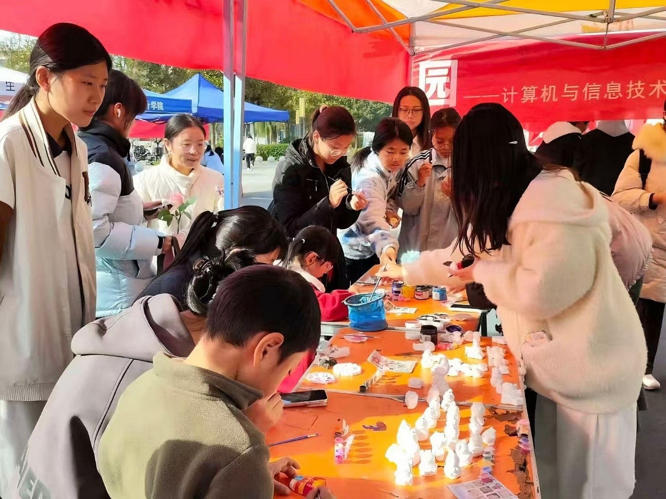 活动现场,志愿者提前布置好石膏白胚、颜料、画笔等材料。同学们自由挑选喜欢的石膏造型,在轻松愉悦的氛围中动手创作。从色彩搭配到图案绘制,每一个环节都展现出她们的巧思与创意。大家互相交流想法、协作配合,既锻炼了动手能力与艺术感知力,也在自由创作的过程中有效释放了压力、加深了彼此之间的友谊。现场还贴心地配备了创作指南与配色参考卡,帮助参与者更好地完成作品,让每位同学都在体验中收获满满的成就感与心灵上的满足。