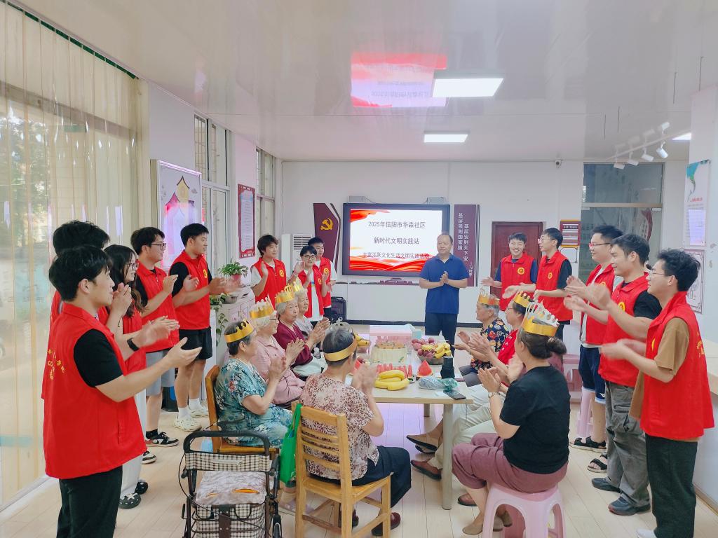 下午四时许,研究生党支部志愿者们身着红色马甲,携带水果、蛋糕来到华森社区为社区内6月份过生日的70岁以上老人过集体生日。支部书记段雪源代表学院向过生日的老人们表达真挚祝福,志愿者们表演了精彩的节目。随后,老人们向志愿者们讲述了华森社区的历史沿革以及他们在来到信阳后的生活经历。志愿者们用热情、倾听和陪伴温暖着现场的每名老人。